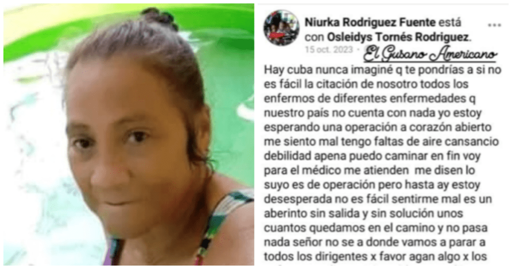 En la publicación de la cubana residente en La Habana con fecha del 15 de octubre de 2023 se lee: Hay Cuba nunca imaginé que te pondrías así. No es fácil la situación de nosotros todos los enfermos de diferentes enfermedades que nuestro país no cuenta con nada. Yo estoy esperando una operación a corazón abierto me siento mal. Tengo faltas de aire cansancio debilidad apenas puedo caminar. En fin voy para el médico me atienden me dicen lo suyo es de operación pero hasta ahí. Estoy desesperada no es fácil sentirme mal. Es un laberinto sin salida y sin solución unos cuantos quedamos en el camino y no pasa nada. Señor no sé a dónde vamos a parar.